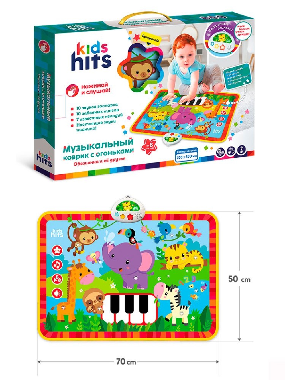 Интерактивная игрушка Kids Hits – удивительный музыкальный коврик с огоньками "Обезьянка и ее друзья", разработанный специально для детей от 8 месяцев. Этот коврик способствует многогранному развитию малыша, открывая двери в мир музыки и ярких эмоций. Уникальные сочетания забавных звуков и приятная на ощупь ткань позволяют ребенку исследовать окружающий мир через все органы чувств.