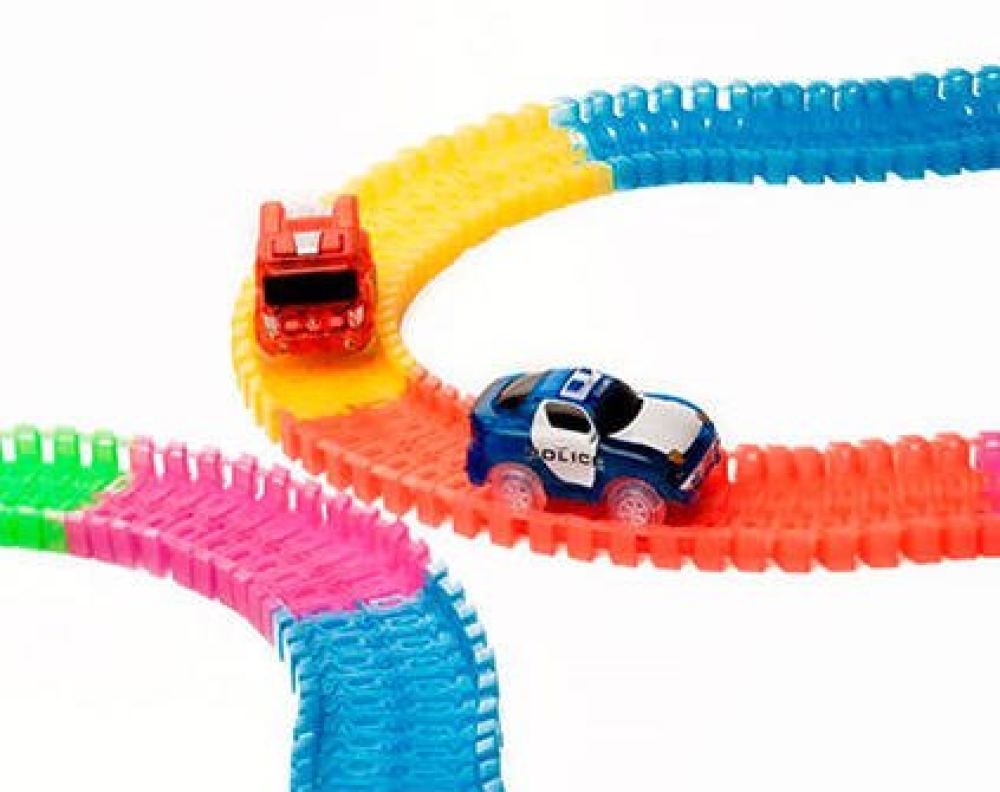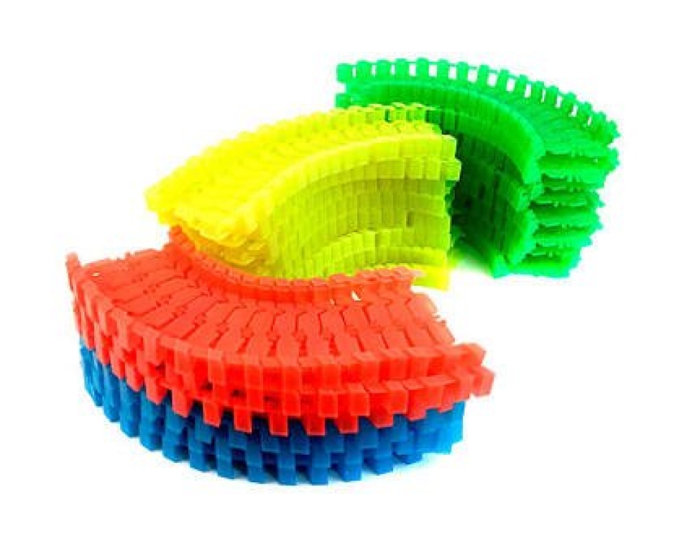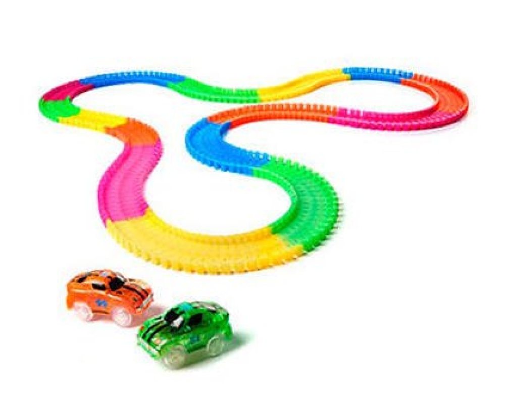 Разноцветный гоночный трек из 310 деталей обязательно порадует каждого малыша от 3-х лет! Детали трассы очень просто собираются, изгибаются во все стороны, образуя самые причудливые виражи. Машинки с яркой светодиодной подсветкой быстро гоняют по треку, вписываясь в крутые повороты. Идущий в комплекте мост добавит им сложности прохождения трассы. А если выключить свет, то все детали трека будут красиво светиться в темноте. Трасса легко сворачивается для хранения, ее не надо разбирать каждый раз