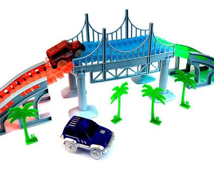 Яркая гоночная трасса из 360 деталей станет любимой игрушкой каждого малыша от 3-х лет. Гибкая трасса общей длиной 5,5 м легко изгибается, образуя самые причудливые повороты, а также светится в темноте! В набор входят 2 машинки со светодиодной подсветкой, мост, перекресток, деревья и дорожные знаки для увлекательных заездов. Машинки на батарейках можно украсить специальными наклейками в комплекте. Трасса легко сворачивается для хранения, ее не надо разбирать.