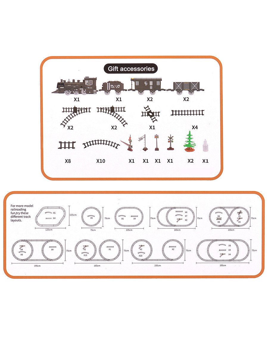 Комплектация | 1 паровоз, вагоны, детали полотна, дорожные знаки, деревья |