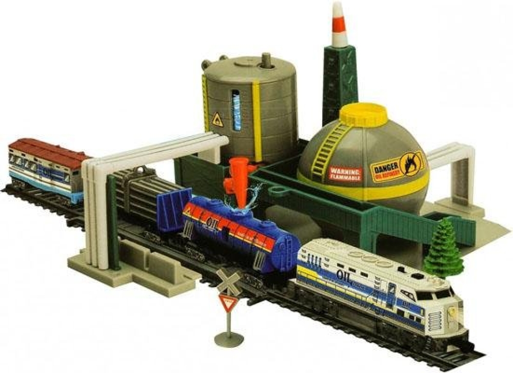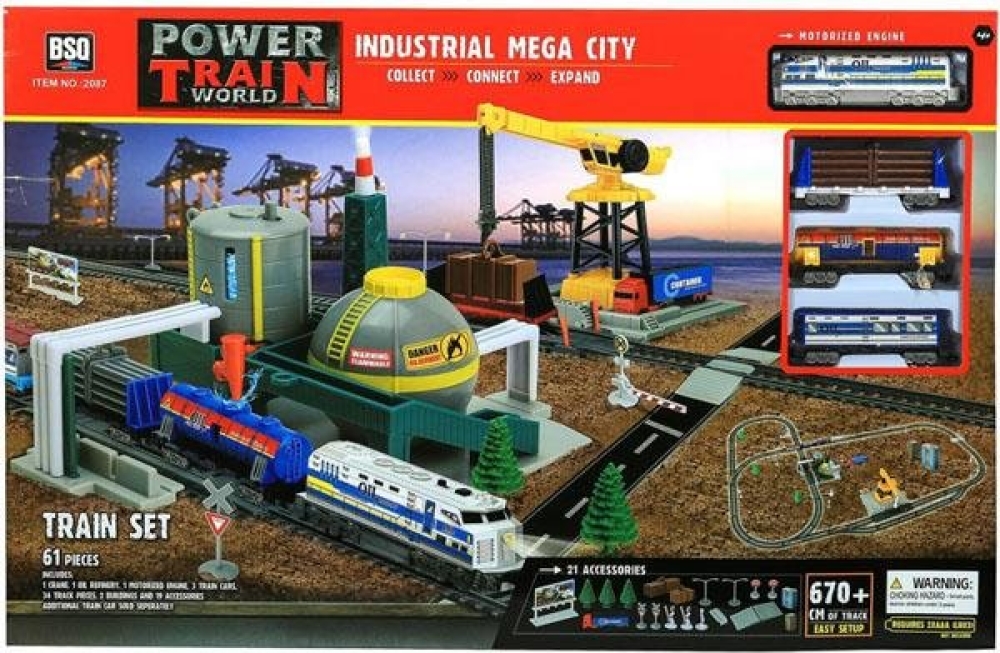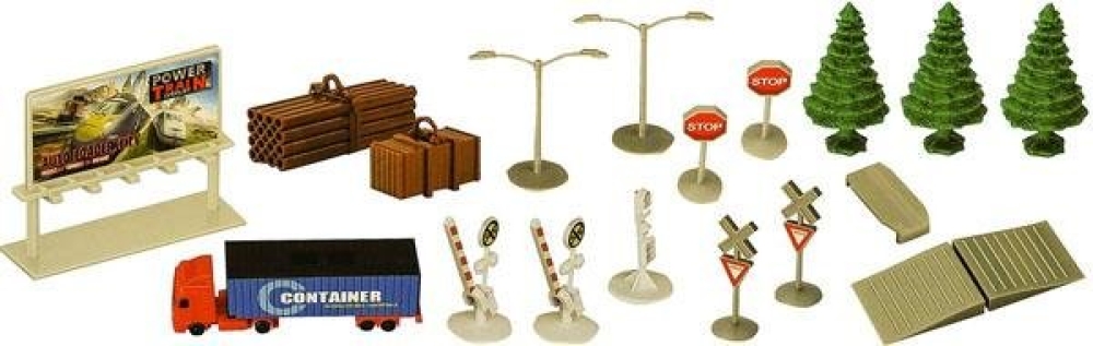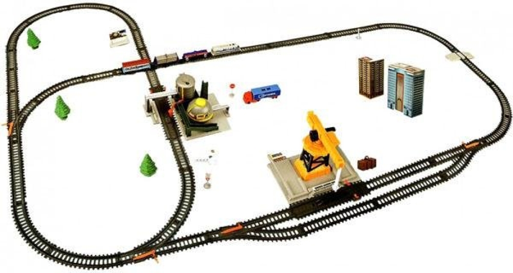 Большая железная дорога с с грузовым составом, который имеет несколько стандартных вагонов контейнеров, а также цистерну для воды. Наполнить ее можно на заводе - специализированной платформе, где вы сможете с помощью нескольких труб перелить воду в цистерну. На другой загрузочной станции вы найдете большой башенный кран для погрузки контейнеров. Для обеспечения предприятия в наборе идет также грузовик контейнеровоз, а поодаль от фабрик можно поставить несколько высотных жилых зданий. На маршруте вы пересечете несколько платформ и еловую рощу. По пути есть 5 развилок, поэтому вы можете выбрать наиболее интересный маршрут следования.