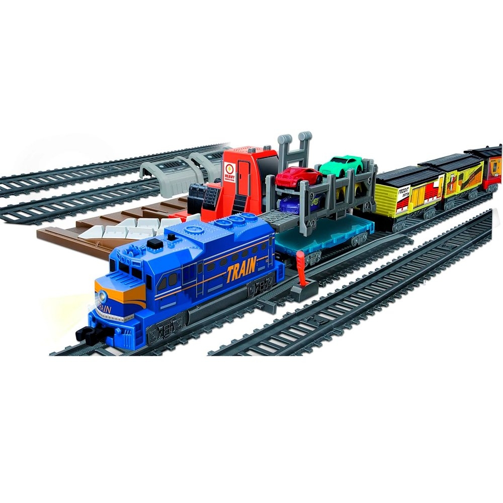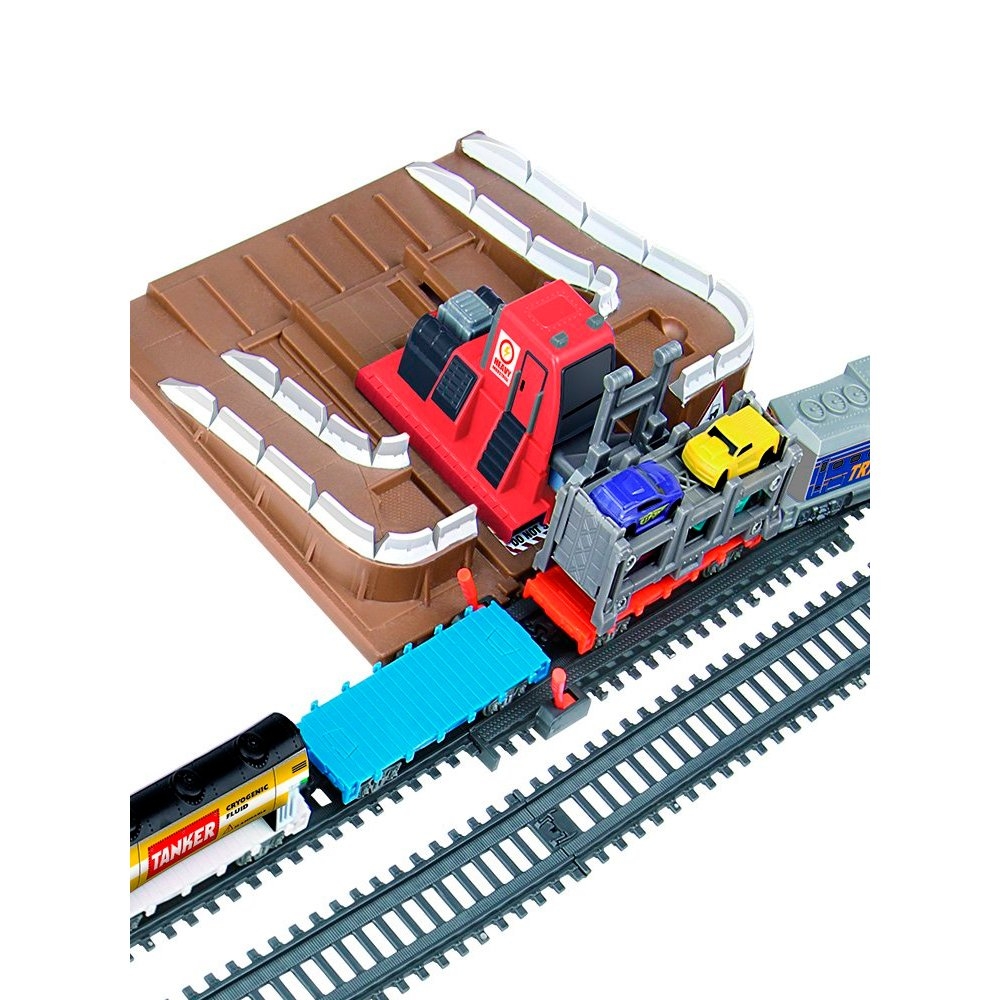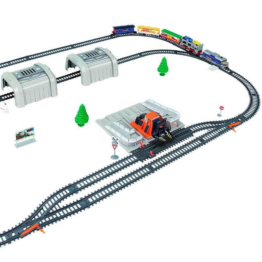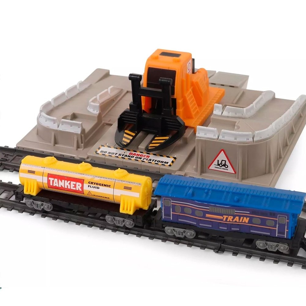 Грузовой локомотив позволит вам устроить интересную игру, т.к. в комплекте идут несколько типов вагонов, например, цистерна, контейнер, а также вагон для автомобилей. Вы сможете погрузить их в вагон с помощью специального станционного погрузчика. На пути следования состава вы сможете увидеть также различные дорожные знаки. Дорога имеет несколько развилок с возможностью регулировки, поэтому маршрут можно изменять.