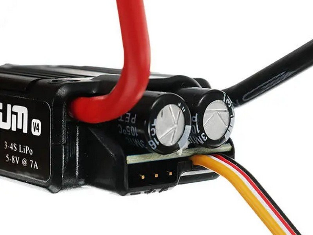 - мощный встроенный переключаемый BEC позволяет обеспечить питание большего числа бортовой электроники (мощные сервоприводы, полетные контроллеры, бортовое освещение и т.д.);