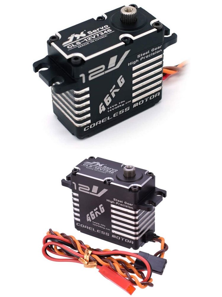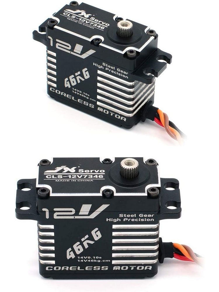 Мощный цифровой сервопривод JX CLS-12V7346 со стальным редуктором и алюминиевым корпусом. Вес: 73 г, усилие на валу: 38 кг/см (11.1V), 47 кг/см (14.0V), скорость: 0.12 с/60° (11.1V), 0.10 с/60° (14.0V).