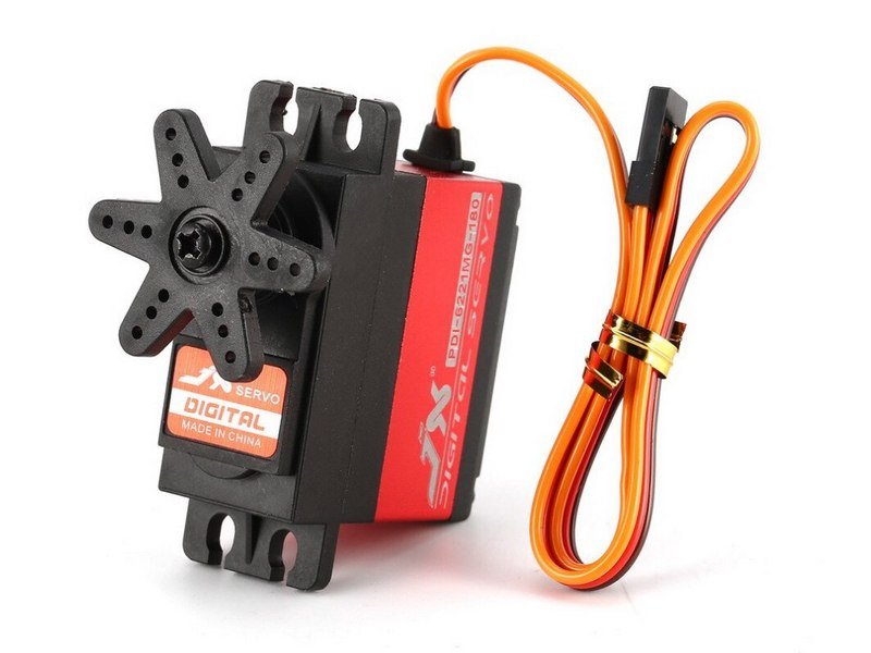 Мощная цифровая сервомашинка стандартного размера JX PDI-6221MG с металлическим редуктором и алюминиевой центральной частью корпуса для лучшего охлаждения. Вес: 62 г, усилие на валу: 17.25 кг/см (4.8V), 20.32 кг/см (6.0V), скорость: 0.18 с/60° (4.8V), скорость: 0.16 с/60° (6.0V).