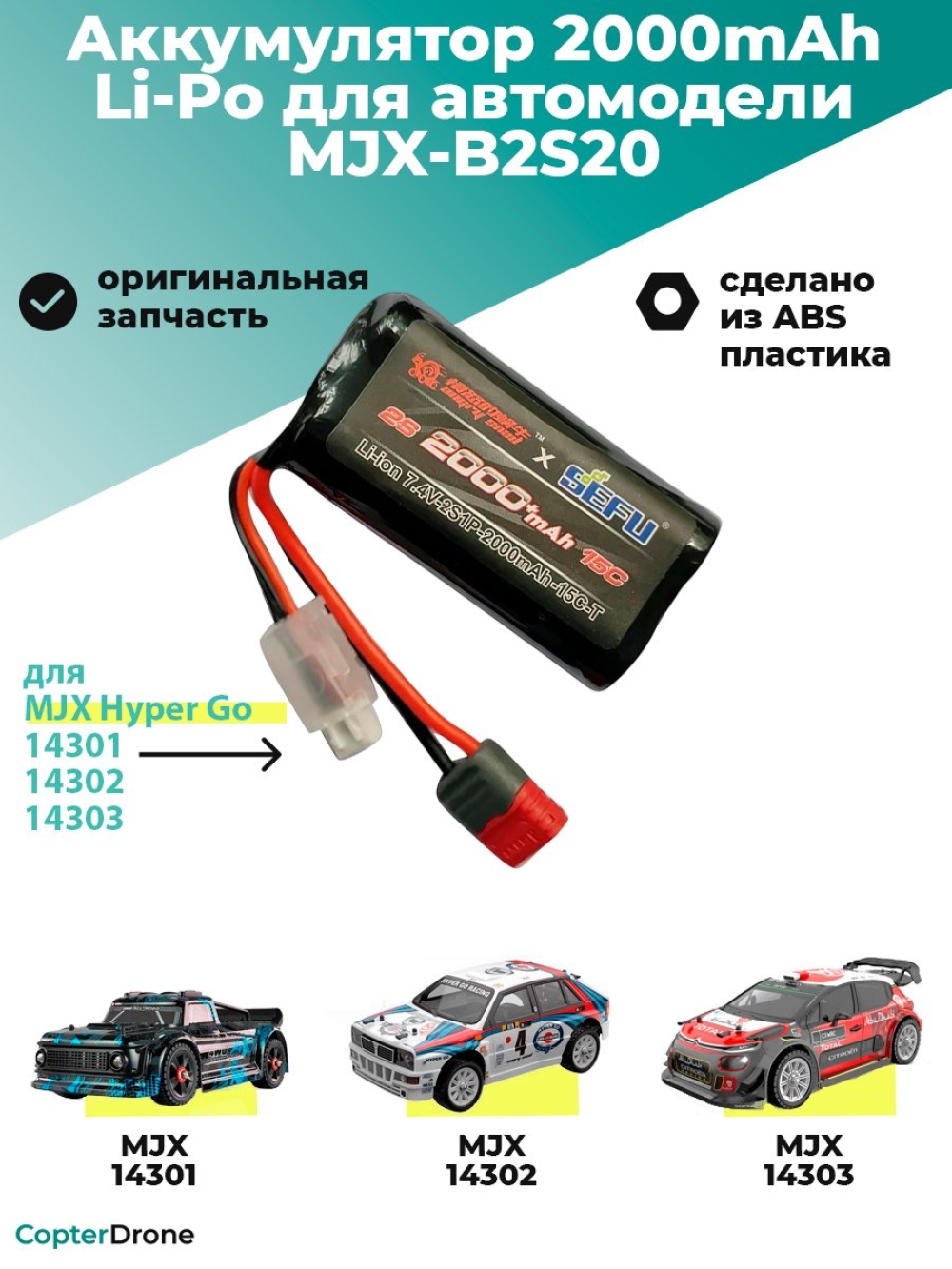 Аккумулятор Li-Po 2000mAh, 7,4V, 25C, T‐plug для автомоделей MJX 14301/14302/14303 - MJX-B2S20