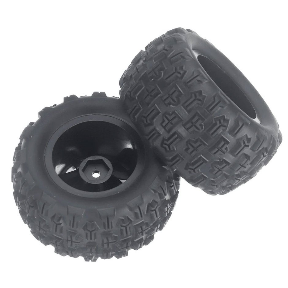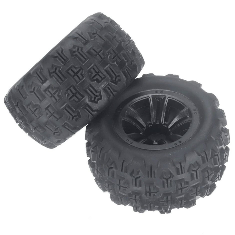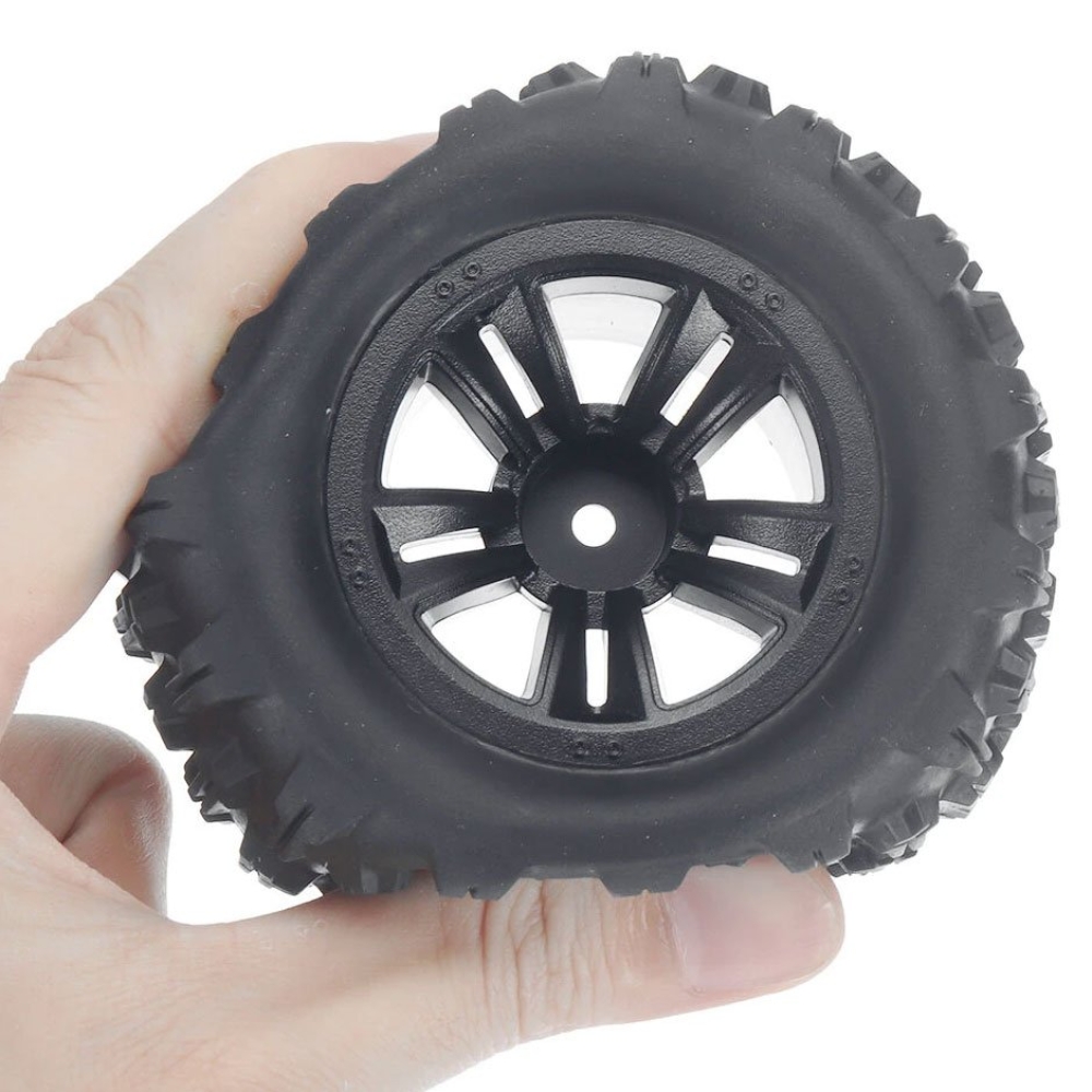 Комплект колес в сборе для радиоуправляемых автомоделей монстров MJX масштаба 1/16. Мощный, гребущий протектор с мягкой резиной хорошим сцеплением является универсальным и подходит под любую поверхность дороги.