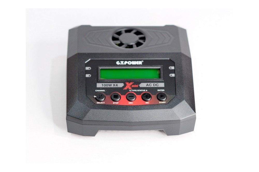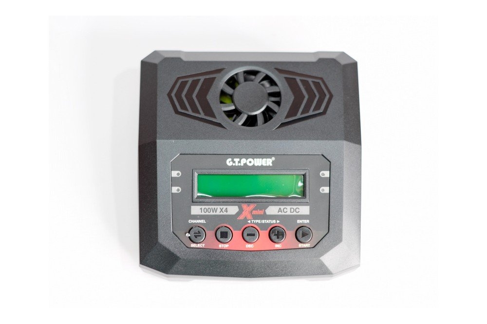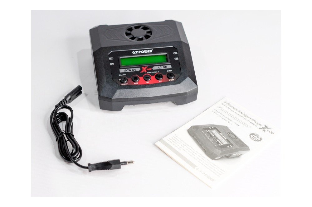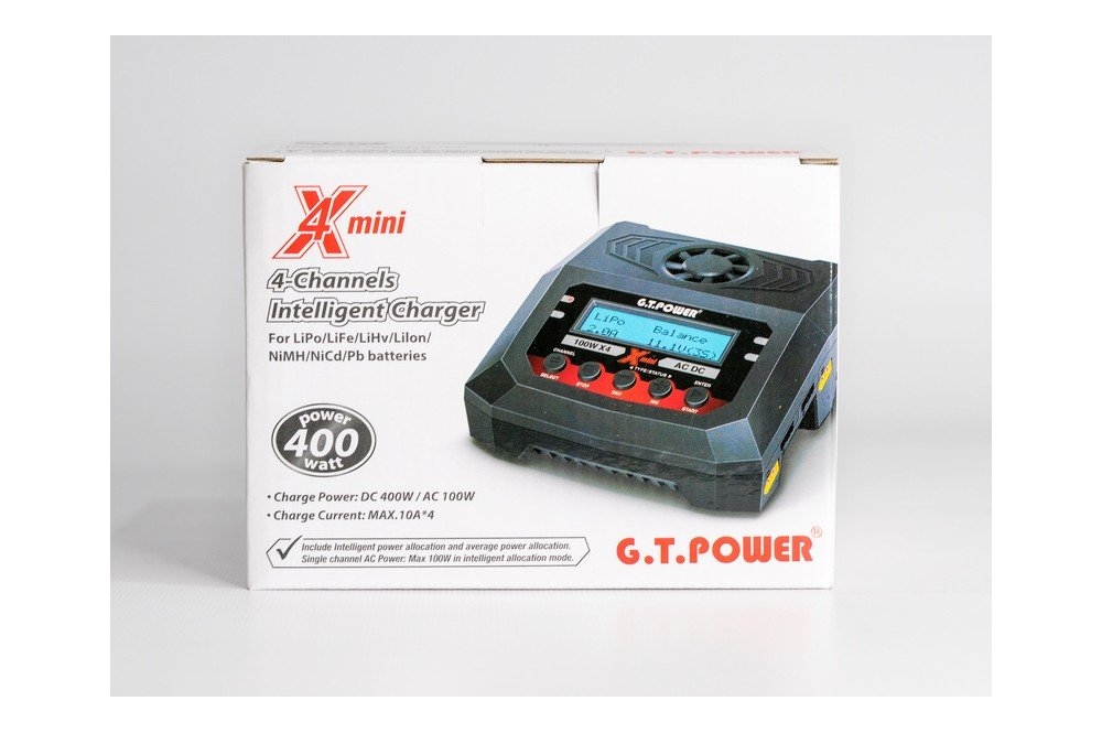 Универсальное интеллектуальное зарядное устройство G.T.Power для NiCd/NiMH, LiPo/LiFe/LiIon/LiHv, Pb батарей. Оснащено четырьмя индивидуальными схемами, позволяющими одновременно заряжать 4 батареи независимо от типа батареи и количества элементов.