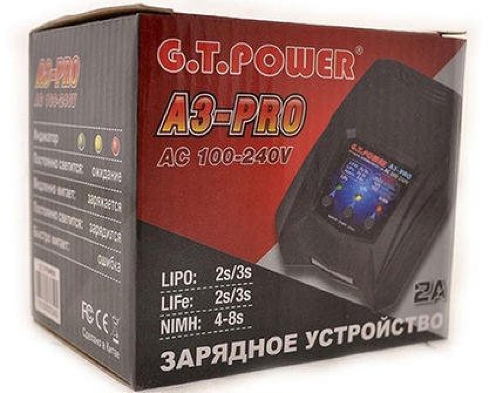 Зарядное устройство G.T.Power A3 PRO, которое может зарядить NiCd/NiMH, LiPo, LiFe аккумуляторы с максимальным током 2.0A. A3 PRO работает от сети 220 В.